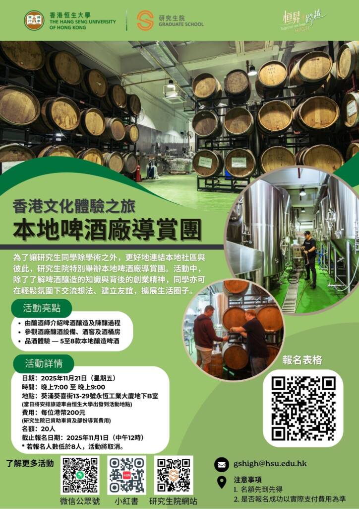 活动预告 活动预告活动回顾 活动预告活动回顾 CTL x GS Workshop Series on "Structural Equation Modeling" Postgraduate Students' Seminar Series 2025 香港文化体验之旅 — 本地啤酒厂导赏团 香港文化体验之旅 — 大澳渔村体验 「香港文化体验团」 – 道风游 CAN! tonese.「粤」难「粤」爱生活广东话班 内地研究生职涯发展关怀计划 -「职场讲座」及「职场广东话」 Library Orientation Programme 2025 – For Postgraduate Students International Symposium on Social Change, Wellbeing and Social Policy Studies in East Asia