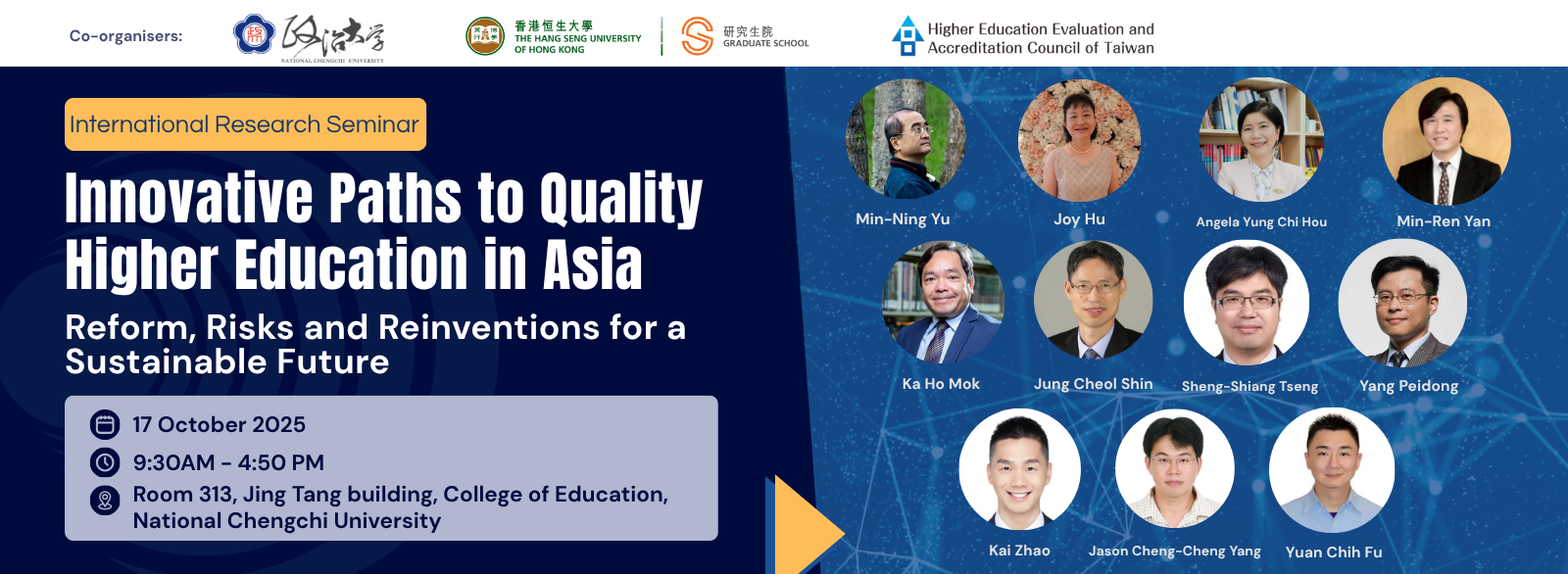 Recognizing the diversity and complexity of higher education systems across Asia, it is acknowledged that there is no singular or prescriptive model for achieving effectiveness and sustainability in governance, research, and teaching and learning innovation. In response, the joint symposium organized by National Chengchi University, Higher Education Evaluation & Accreditation Council of Taiwan and The Hang Seng University of Hong Kong aims to convene leading scholars in the field of higher education to critically examine contemporary system reforms and evolving quality standards under emerging regulatory paradigms. The symposium will further explore strategies for enhancing stakeholder engagement, aligning educational outcomes with labor market demands, and advancing innovation, digital transformation, and SDG integration within higher education institutions.