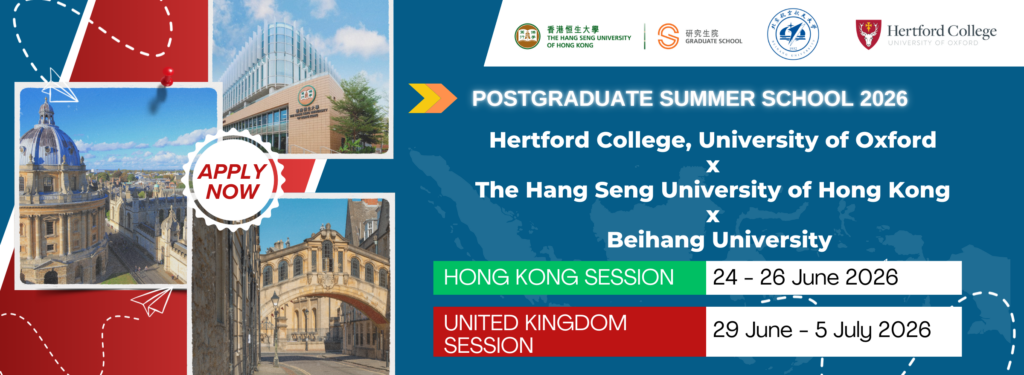 The Hang Seng University of Hong Kong (HSUHK) is delighted to partner with Hertford College, University of Oxford and Beihang University, to host the Postgraduate Summer School 2026, a flagship initiative of the Graduate School (GS).This immersive programme immerses outstanding students in the historic setting of Oxford, featuring sessions on management science (including decision analysis, leadership, and strategy), AI ethics, UK social issues, and cross-cultural communication. To ensure students can fully enjoy and benefit from this enriching learning experience, HSUHK will award scholarships to nominated students.