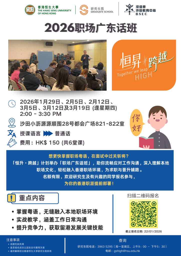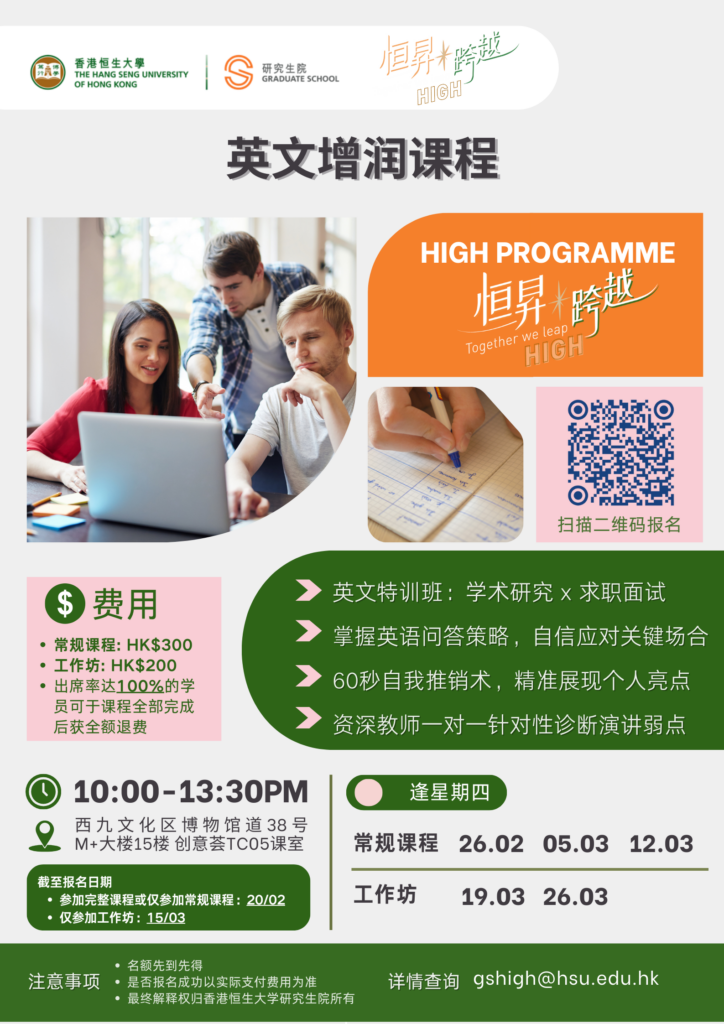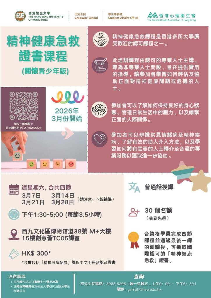 Upcoming Events Upcoming EventsEvent Highlights Upcoming EventsEvent Highlights 2026 HIGH Programme – Mental Health First Aid Certificate Course (Youth Version) 2026 HIGH Programme – English Enhancement Course 2026 HIGH Programme – Workplace Cantonese Class HSUHK Postgraduate Programmes Promotional Talk at Guangzhou – Nansha (Chinese Version Only) 2026 EASP Annual Conference : Social Policy in Asia in Times of Multiple Disruptions Postgraduate Students' Seminar Series 2025-26