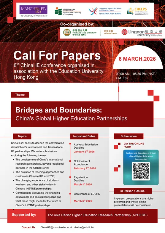 Upcoming Events Upcoming EventsEvent Highlights Upcoming EventsEvent Highlights The 8th China and Higher Education Conference Nordic-East Asia Higher Education Research Symposium 2026: Turbulent times in Higher Education and Society Student-Initiated Activity: Daily Cantonese Class | HIGH Programme University of Manchester East Asia Panel – The Future of Education Research and Scholarship 2026 HIGH Programme – One-on-One English Online Consultation OXFORD x HSUHK : Postgraduate Summer School 2026 International Symposium on Governance, Society, and Resilience: Critical Reflections from East Asia UCL School of Management X HSUHK: Postgraduate Summer School 2026 HSUHK – Manchester Roundtable Discussion « Page1 Page2 »
