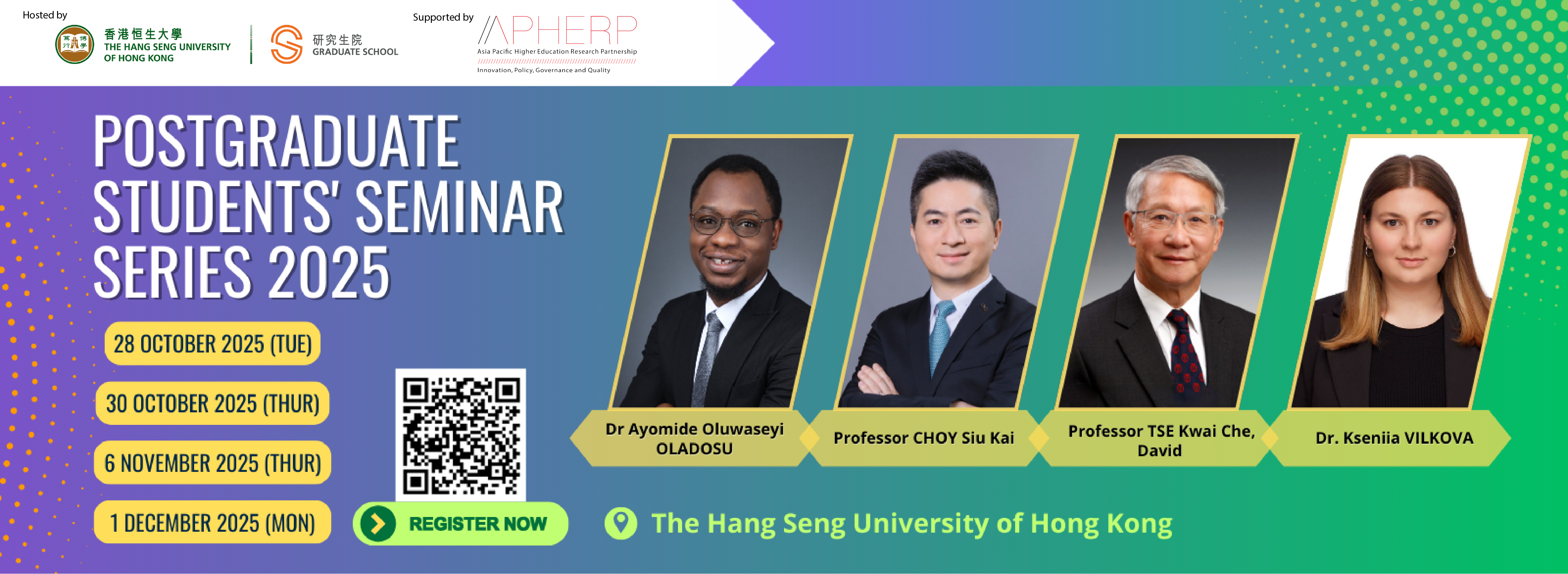 The Graduate School is proud to host the Postgraduate Students' Seminar Series 2025-26, scheduled to take place from October 2025 to January 2026 at The Hang Seng University of Hong Kong. This seminar series is designed to empower postgraduate students by providing expert guidance on essential research processes and offering insights into thriving in today's…