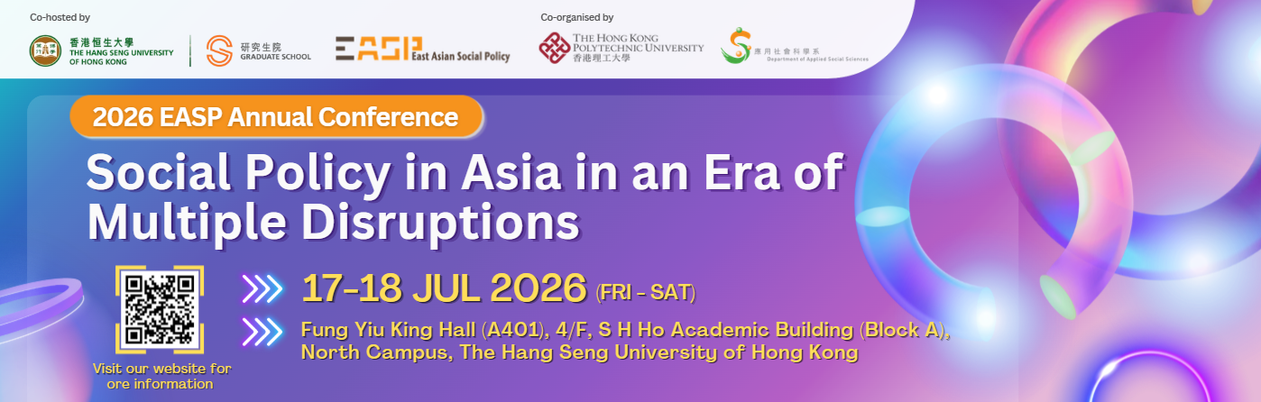 In light of the complex challenges shaping our world today, the 2026 EASP Annual Conference – Social Policy in Asia in an Era of Multiple Disruptions seeks to bring together scholars and practitioners to exchange ideas, share research, and foster meaningful collaboration. The conference is co-hosted by the Graduate School of The Hang Seng University of Hong Kong and the East Asian Social Policy Research Network (EASP), and co-organised with the Department of Applied Social Sciences (APSS) of The Hong Kong Polytechnic University. The event will be held on 17–18 July 2026 (Friday to Saturday) at The Hang Seng University of Hong Kong (HSUHK) and will take place in person only.